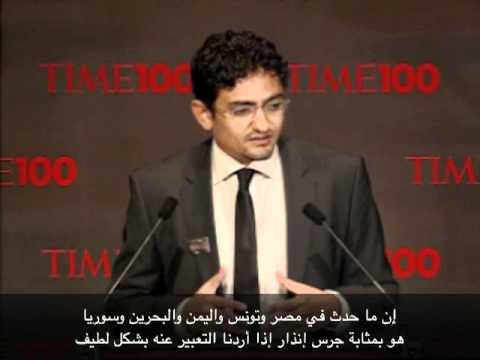 وأضاف وائل ساخرا: "التفتيش العشوائي في المطارات، ليس من هذه المشاكل، يمكنهم القبض عليك، ووضعك في المعتقل بسبب رأيك، إن ما حدث في مصر وتونس واليمن والبحرين وسوريا هو بمثابة جرس إنذار، إذا أردنا التعبير عنه بشكل لطيف، ويمكن أيضا أن نسميه صفعة على وجه المجتمع الدولي، هؤلاء السياسيون الذين فضلوا الاستقرار على الديمقراطية، وأن المصالح أهم بكثير من المبادئ، فاستقرار المنطقة أهم عندهم من ظروف المعيشة السيئة للشعوب، جرس الإنذار رسالة لنا جميعا، ويجب علينا جميعا أن نستوعب الدرس، اليوم أقول لكم أنه إذا كان اليوم يمكن للأفراد أن يقدموا أعمالا كبيرة لبلادهم باستخدام الإنترنت، والتواصل المباشر، دون الحاجة لوسائل الإعلام، أعتقد أن المشاهير أمثالكم، عليهم دورا ومسئولية أكبر، أعتقد أنه من المهم الآن أن تؤمنوا أنكم قادرون على تغيير العالم".
